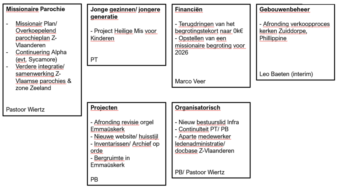 Tenslotte nog een aantal opmerkingen met betrekking tot onze organisatie. Zoals ook het geval met het aantal actieve vrijwilligers en PKC leden (b)lijkt het zeer lastig om nieuwe bestuursleden te vinden die het PB kunnen versterken, bijvoorbeeld op het gebied van gebouwenbeheer/ infra en externe communicatie/ promotie. We blijven hier als PB actief mee bezig en zullen ook meer en meer de samenwerking zoeken met de andere Zeeuws-Vlaamse parochies om de continuïteit van onze parochie te kunnen blijven borgen. Vooruitkijkend naar 2026 blijven de speerpunten overwegend hetzelfde als in 2024 en 2025: Missionaire Parochie, Jonge gezinnen/ jongere generatie, Financiën, Gebouwenbeheer, Projecten en Organisatorisch.